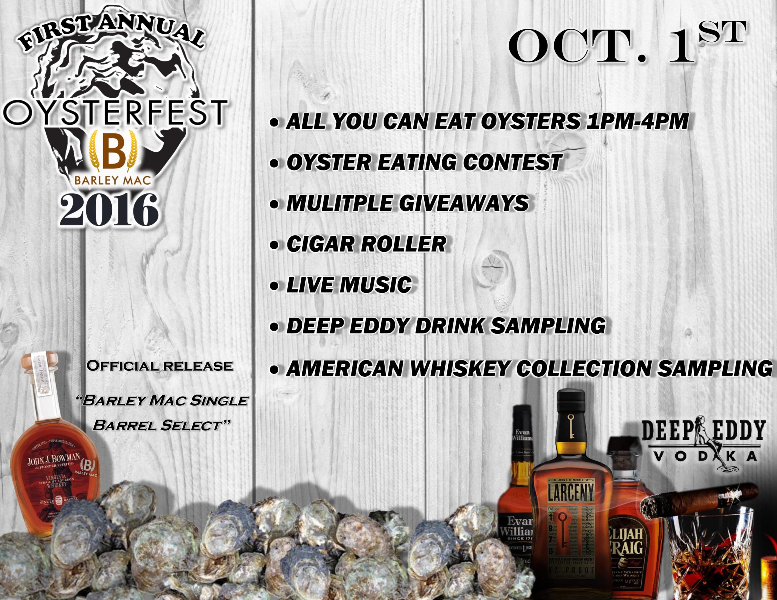 Join us at Barley Mac on Saturday, October 1st from 1pm-4pm for our 1st Annual Oyster Fest! A celebration of all things oyster, we’ll be converting the Barley Mac patio to a big, beautiful outdoor raw bar. Tickets include unlimited all-you-can-eat oysters throughout the event. The event will include but not be limited to: