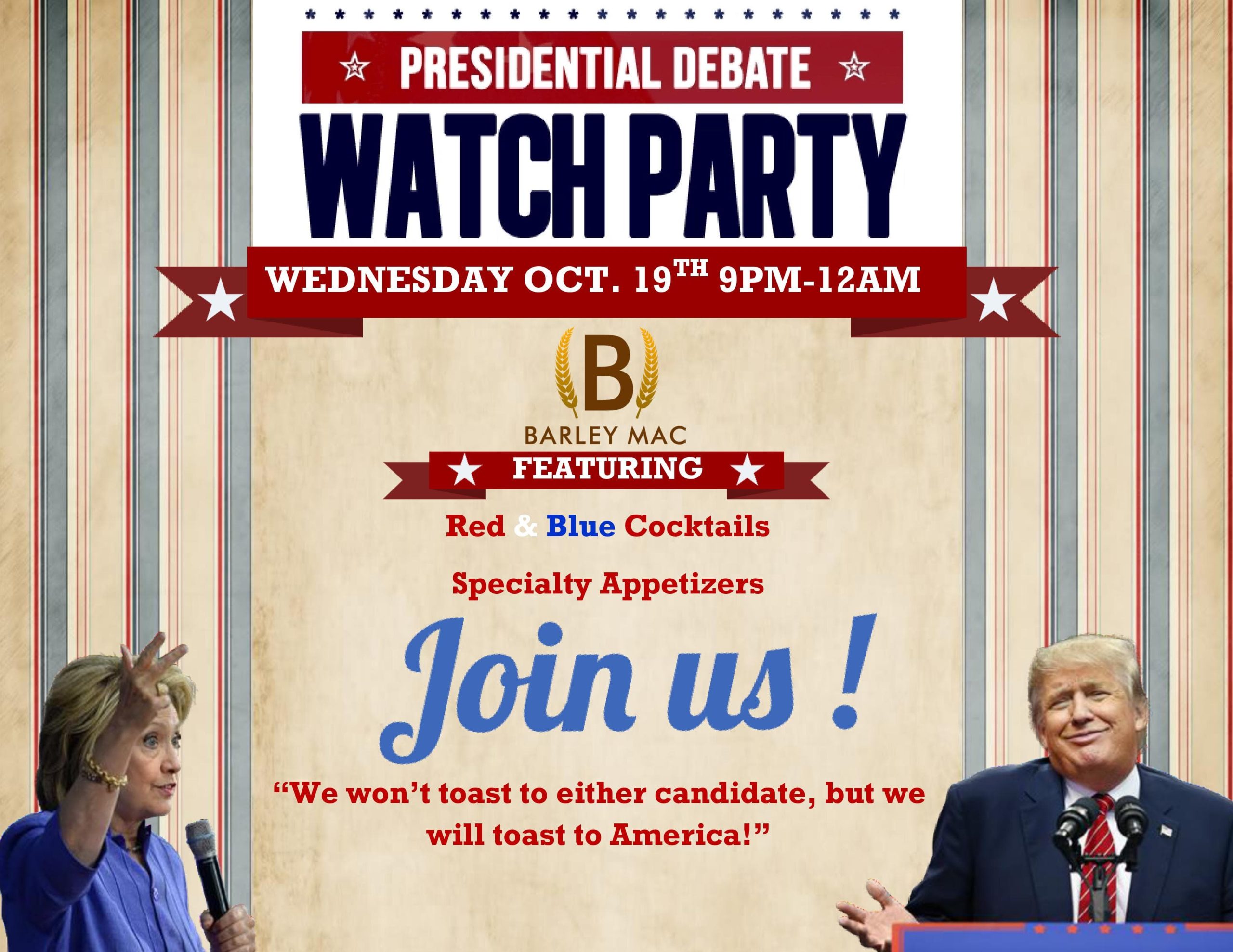 Catch all of the action during the 3rd Presidential Debate by attending Barley Mac’s Watch Party! On October 19th, tune in with our Arlington restaurant as we watch Hillary Clinton and Donald Trump go head-to-head one last time before the election. (And no matter which side of the aisle you’re on, our delicious red, white and blue specialty cocktails will definitely win your vote!)